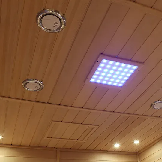 3. हीटिंग और प्रकाश अनुभव: समान रूप से वितरित दूर-अवरक्त हीटिंग पैनल कोमल, भेदने वाली गर्मी प्रदान करते हैं; शीर्ष + साइड परिवेश रोशनी (गर्म टोन में) विश्राम को बढ़ावा देती है और घुटन या उत्पीड़न से बचती है