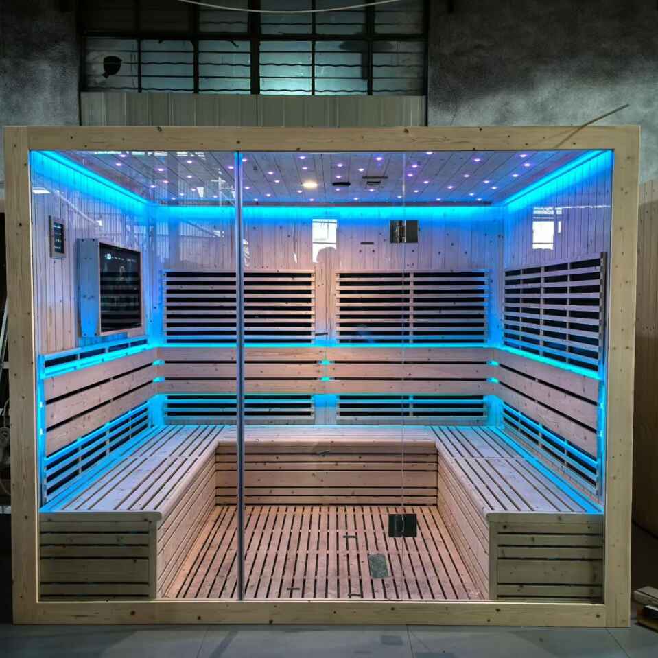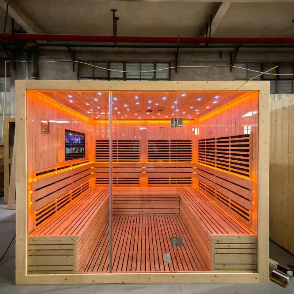 5-10 उपयोगकर्ताओं के लिए डिज़ाइन किया गया, यह सौना कमरा पारिवारिक समारोहों, मित्र मिलन समारोहों या स्पा और वेलनेस सेंटर जैसे छोटे व्यावसायिक स्थानों के लिए आदर्श है। उच्च गुणवत्ता वाली सॉना लकड़ी से निर्मित, यह आपके स्थान में प्राकृतिक, गर्म सौंदर्य लाते हुए स्थायित्व सुनिश्चित करता है।