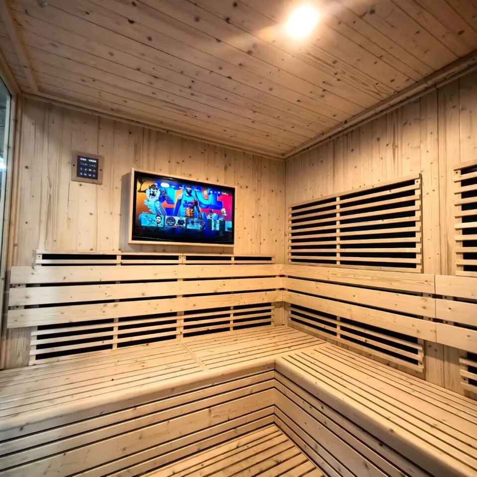 अंतर्निर्मित एलसीडी टीवी (छवि में दिखाई दे रहा है) सॉना अनुभव को बदल देता है:
