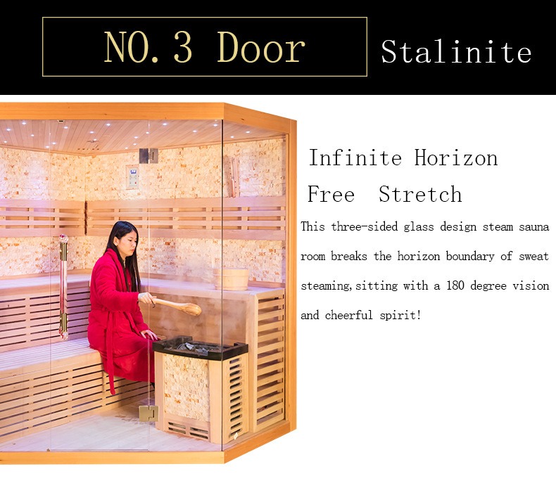 नवीन रूप से तीन-तरफा स्टालिनाइट विशेष कांच के दरवाजे की संरचना की विशेषता के साथ, यह ग्लास विशेष उच्च तापमान टेम्परिंग उपचार से गुजरता है, जो उत्कृष्ट गर्मी प्रतिरोध और प्रभाव प्रतिरोध प्रदान करता है। यह सॉना के अंदर 70℃ से अधिक तापमान पर भी स्थिरता बनाए रखता है, अल्ट्रा-उच्च पारदर्शिता और कोई ऑप्टिकल विरूपण नहीं। तीन-तरफा ग्लास डिज़ाइन 180-डिग्री अबाधित विस्तृत दृश्य प्राप्त करता है, जो पारंपरिक सौना की तंग और बंद भावना को पूरी तरह से तोड़ देता है। उपयोगकर्ता सॉना का आनंद लेते हुए बाहरी वातावरण के साथ दृश्य संपर्क बनाए रख सकते हैं, जिससे यह घर की बालकनियों, आंगनों और अन्य परिदृश्यों के लिए आदर्श बन जाता है - जिससे आप अधिक आरामदायक और आरामदायक मन और शरीर के लिए हीट थेरेपी का अनुभव करते हुए बाहरी दृश्यों की सराहना कर सकते हैं। इसके अतिरिक्त, आंतरिक रूप से एकीकृत स्टारलाइट माहौल प्रणाली शीर्ष और साइड की दीवारों पर छिपी एलईडी लाइट स्ट्रिप्स के माध्यम से एक टिमटिमाते सितारे का प्रभाव पैदा करती है। नरम रोशनी गर्म भाप को पूरक करती है, प्रभावी ढंग से आंखों की थकान से राहत देती है और एक गहन और सुखद सौना वातावरण को बढ़ावा देती है।