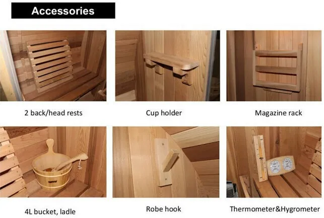 - सुविधा सहायक उपकरण: कप होल्डर, पत्रिका रैक, अंतर्निर्मित कपड़े हैंगर (कपड़े और तौलिये को आकस्मिक रूप से संग्रहीत करने के लिए, सॉना सत्र के दौरान अव्यवस्था को खत्म करने के लिए);